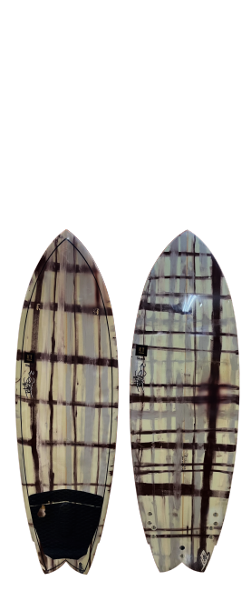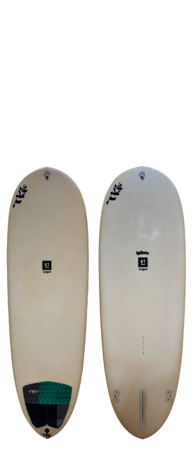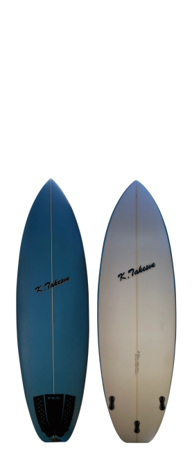 撮影状況でフラッシュや蛍光灯が反射している部分がありますが、実際には色抜けがない、アウトラインの美しいサーフボードです。